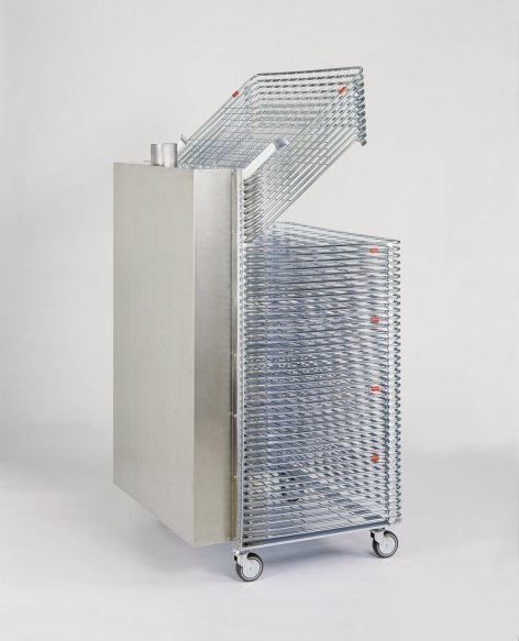 Hier kann beispielhaft der "AIRMASTER" genannt werden. Ein Gerät welches einfach an jedem standardmäßigen Stapeltrockner angebracht werden kann und dafür sorgt, daß die Lösemittel die während des Trocknungsvorganges aus dem Stapeltrockner in den Arbeitsraum entweichen würden direkt am Entstehungsort abgesaugt werden. Ein günstiger Nebeneffekt ist´, daß die Trocknung der Drucke zusätzlich beschleunigt wird!