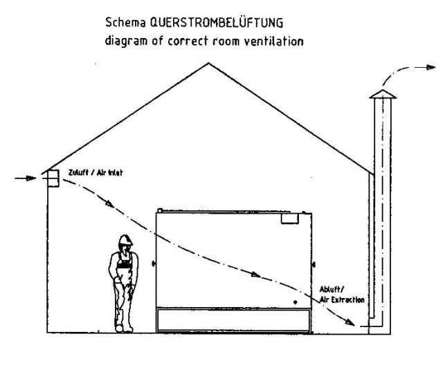 Dabei ist zu beachten, daß die im Siebdruck verwendeten Lösemittel in der Regel schwerer als Luft sind. D. h. die ideale Form der richtigen Be- und Entlüftung ist so konzipiert, daß die Zuluft in Deckenhöhe eingeblasen und die Abluft in Bodennähe abgesaugt wird. Am besten so, daß die Zuluft von hinten in Richtung Arbeitsplatz strömen kann, damit steht der Mitarbeiter im sauberen Luftstrom (s. Skizze).