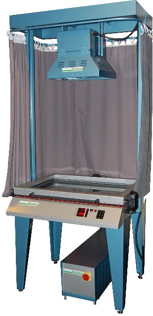 kostengünstige und platzsparende Kombination aus Vakuumkopierrahmen, Kopierlampe, und UV-Schutzvorhang!